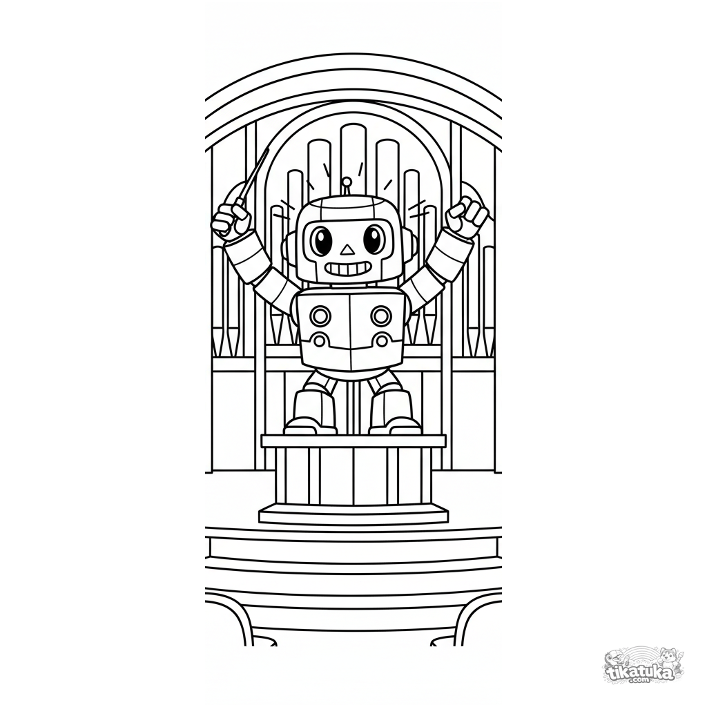 Ausmalbild für Kinder von 7-9 Jahren: Ein freundlicher Roboter-Dirigent steht auf einem Podium und dirigiert ein imaginäres Orchester auf einer Konzerthallenbühne.