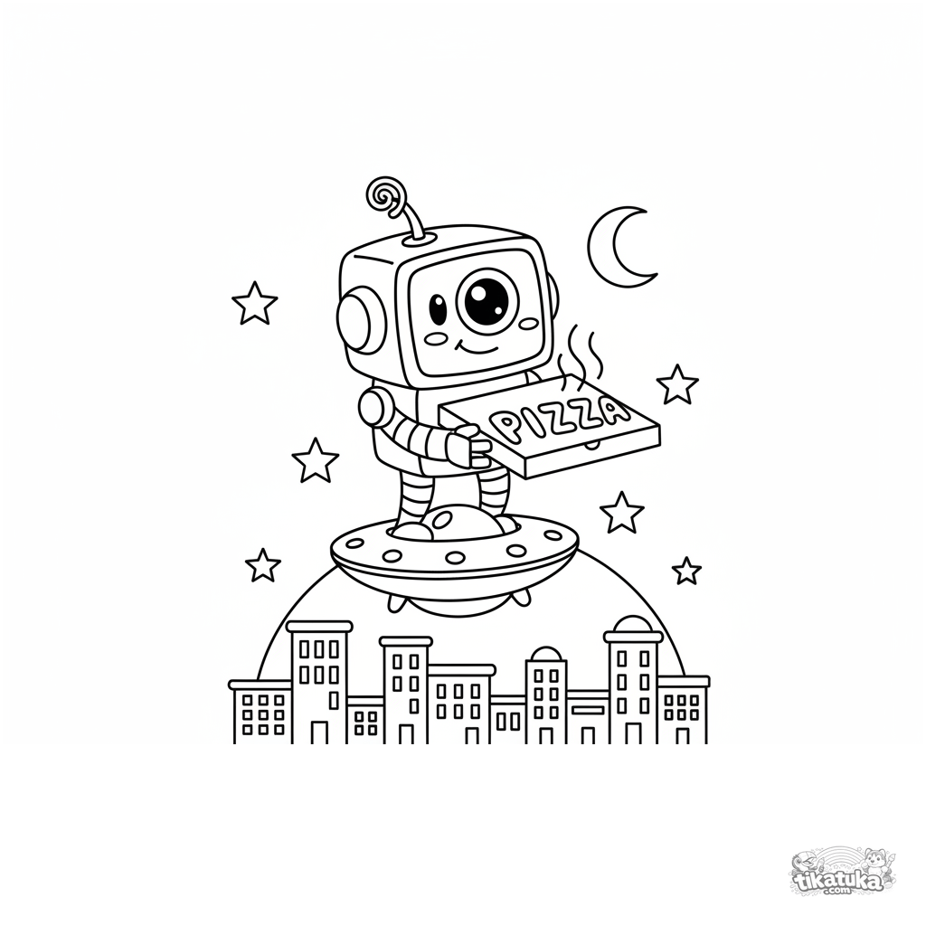 Ausmalbild für Jungen 4-6: Ein freundlicher Lieferroboter balanciert auf einer fliegenden Untertasse und trägt eine Pizzabox über einer Stadt.