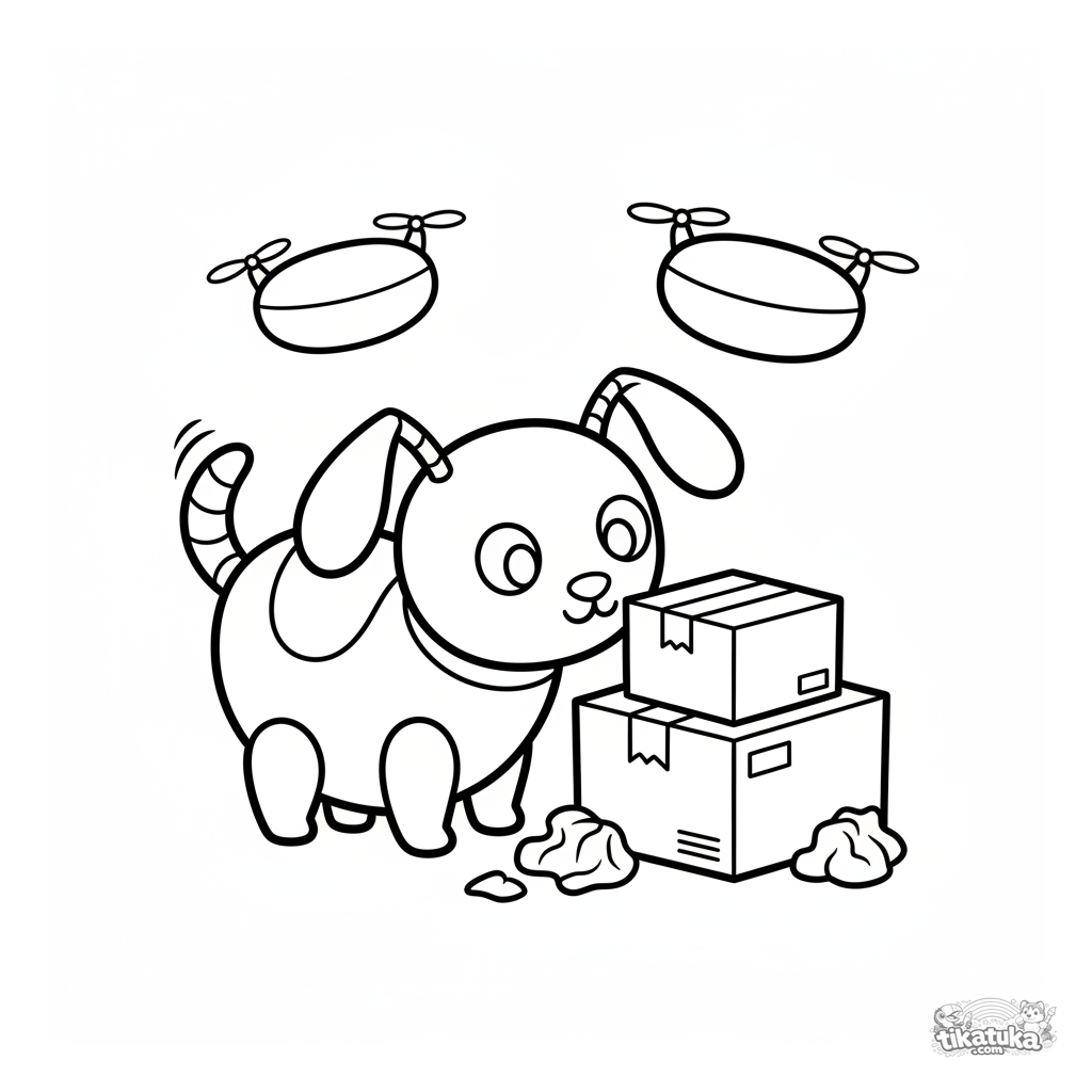 Ausmalbild für Kleinkinder: Ein freundlicher Roboterhund erkundet ein Lagerhaus zwischen Kartons und fliegenden Drohnen. Einfache Formen und breite Ränder.