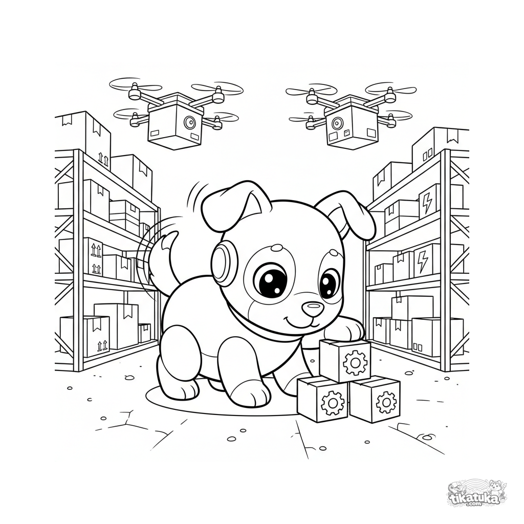 Ausmalbild für Kinder 4-6: Ein freundlicher Roboterhund sortiert Kisten in einem Lagerhaus zwischen Drohnen. Einfache Formen und fröhlicher Charakter.