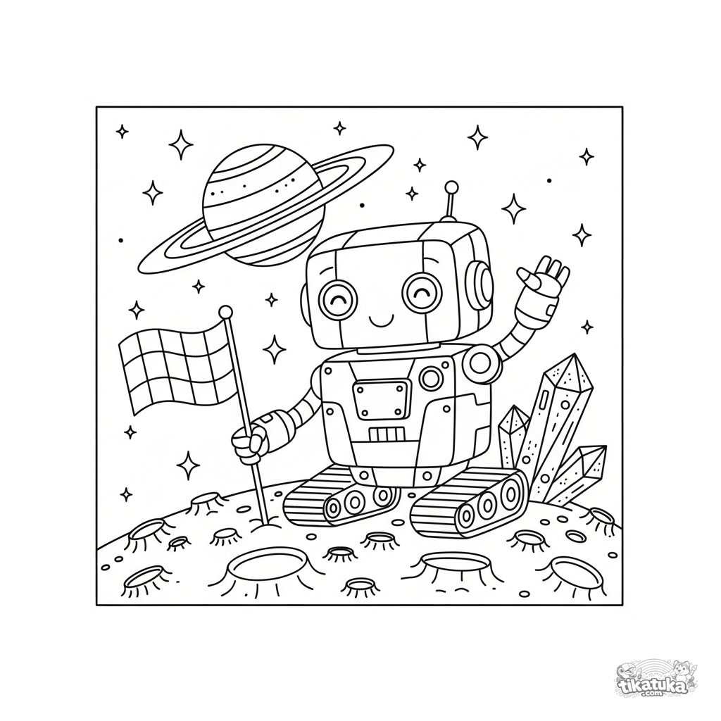 Ausmalbild einer Weltraumszene: Ein freundlicher Roboter pflanzt eine Flagge auf einen kraterübersäten Alien-Mond. Für Kinder von 6 bis 9 Jahren.