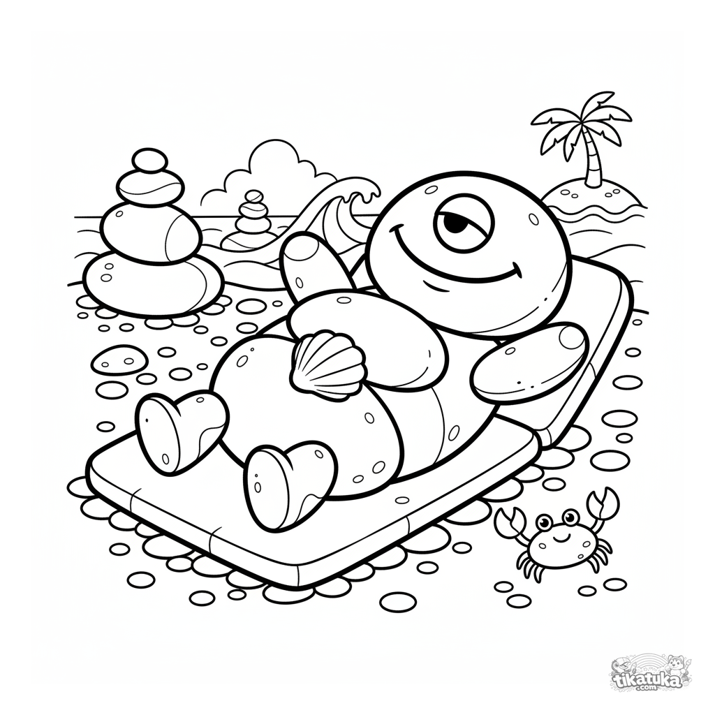 Ausmalbild eines freundlichen Felsmonsters, das sich auf einem Kieselstrand sonnt. Für Kinder von 3 bis 6 Jahren. Eine niedliche, friedliche Szene.