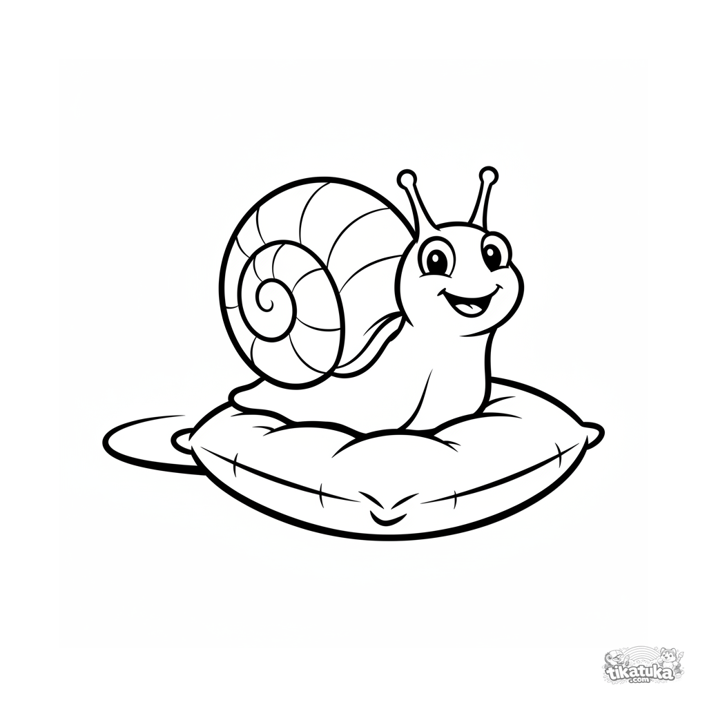 Einfaches Ausmalbild für 2-3 Jahre: eine lächelnde Schnecke mit Schneckenhaus kriecht auf einem weichen Kissen. Sehr wenige innere Linien.