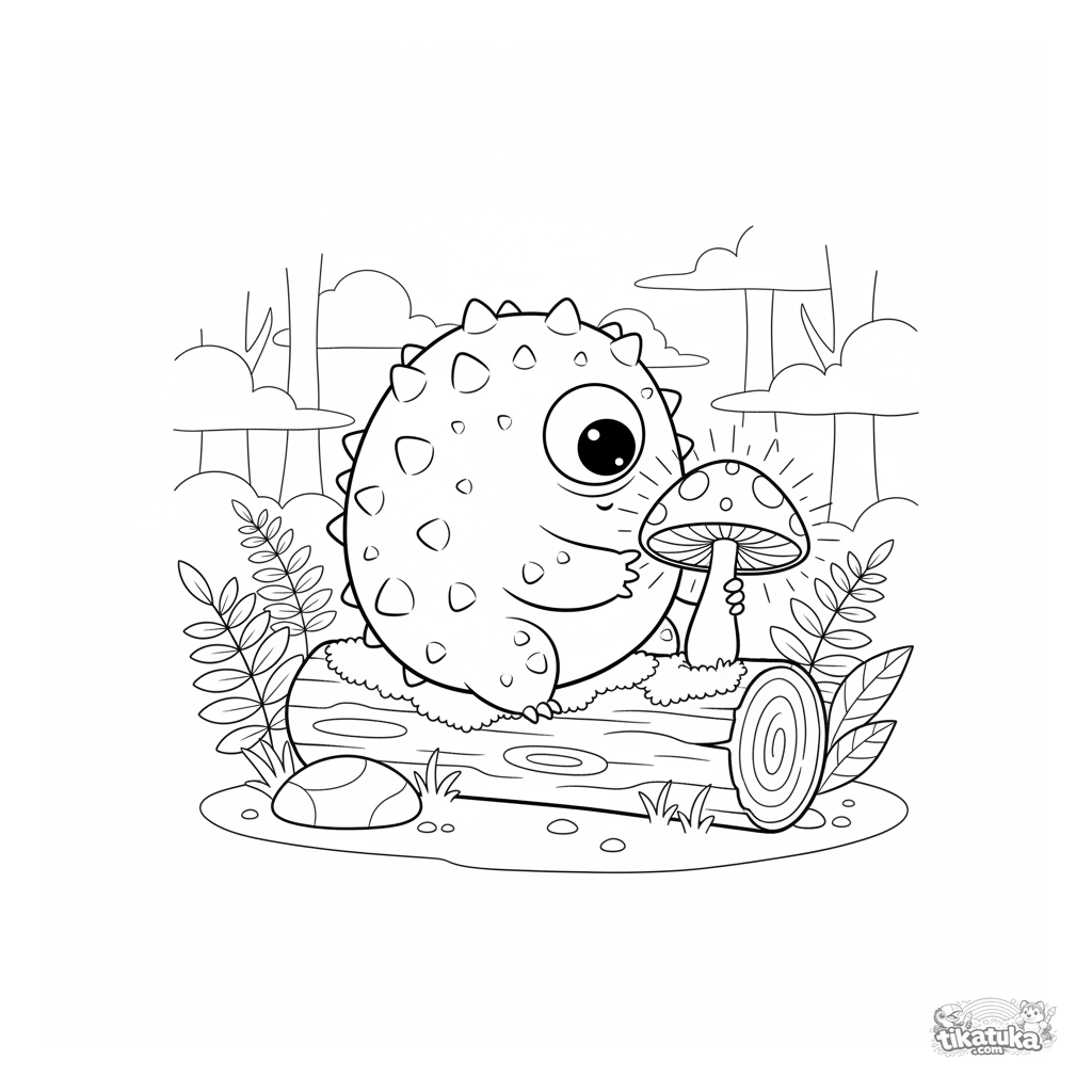 Ausmalbild eines freundlichen, stacheligen Blob-Monsters für Kinder von 4-6 Jahren. Es sitzt im Wald auf einem Baumstamm und berührt einen leuchtenden Pilz. Einfache Formen, niedliche Szene.