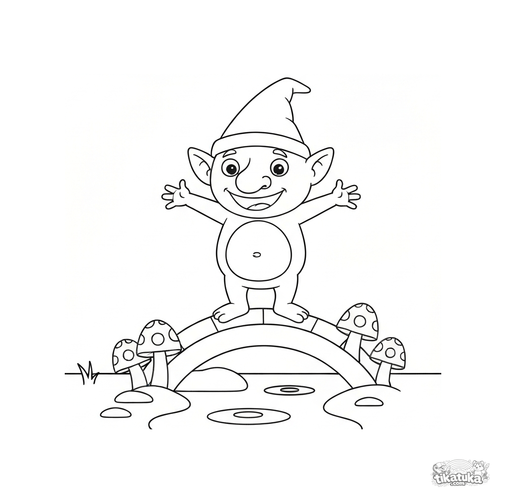 Ausmalbild für Kleinkinder: ein freundlicher, lächelnder Troll balanciert auf einer Pilzbrücke über einem Bach. Einfache und fröhliche Zeichnung für 2-4 Jahre.