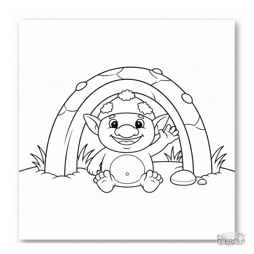Kinder-Ausmalbild: Ein freundlicher Troll sitzt unter einer magischen Pilz-Brücke. Einfache Zeichnung mit großen Details.