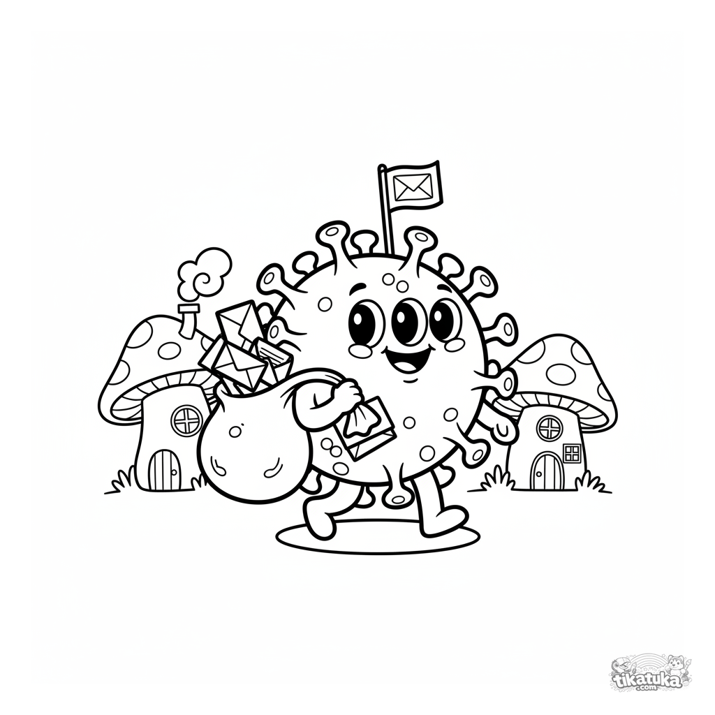 Einfaches Ausmalbild eines niedlichen Cartoon-Virus, der als Postbote arbeitet. Für Kleinkinder von 2-5 Jahren. Große, einfache Formen und ein freundlicher Charakter.