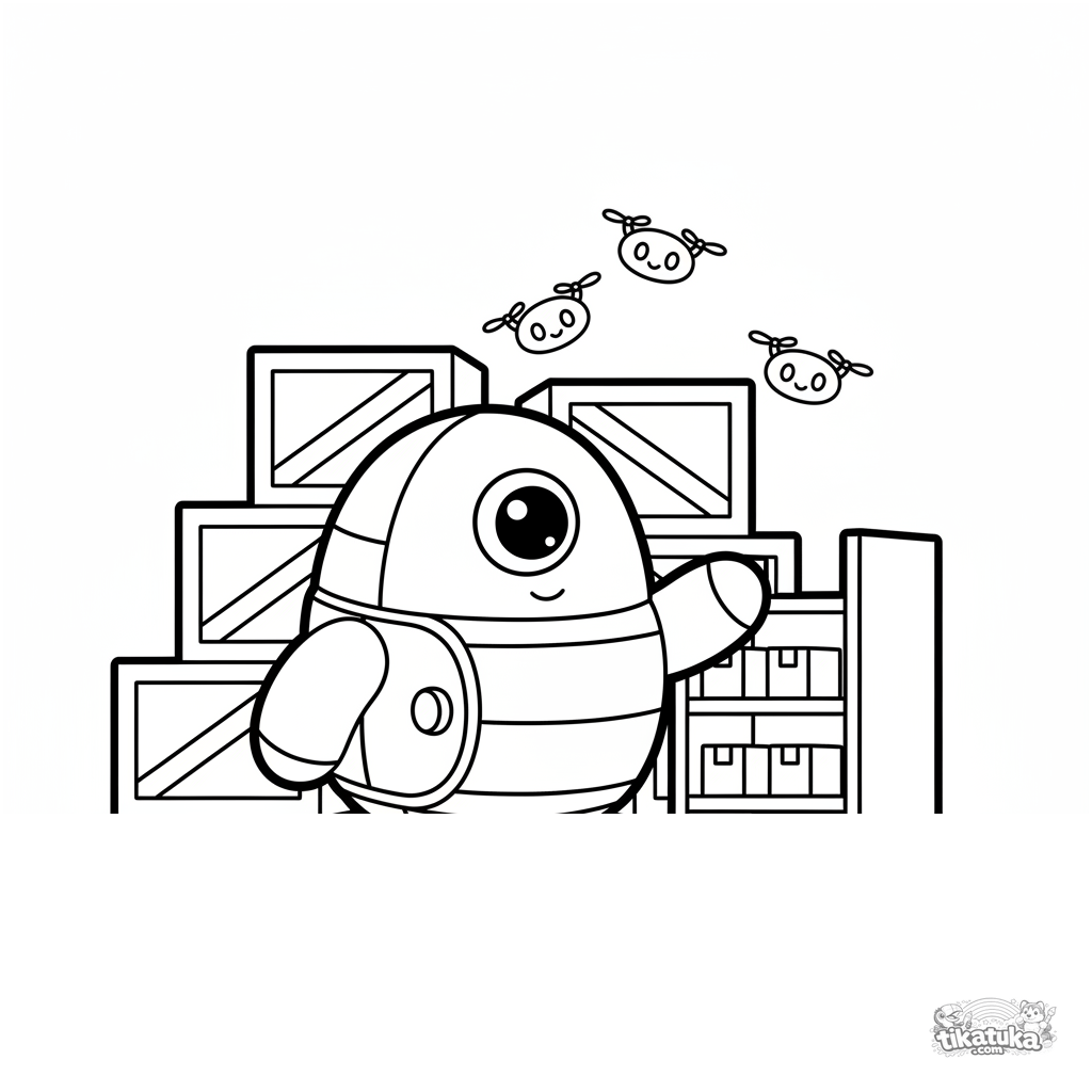 Ausmalbild für Kleinkinder 2-3 Jahre: ein freundlicher runder Roboter sortiert Kisten in einem Lagerhaus zwischen Regalen und fliegenden Drohnen. Einfache Formen, breite Ränder.