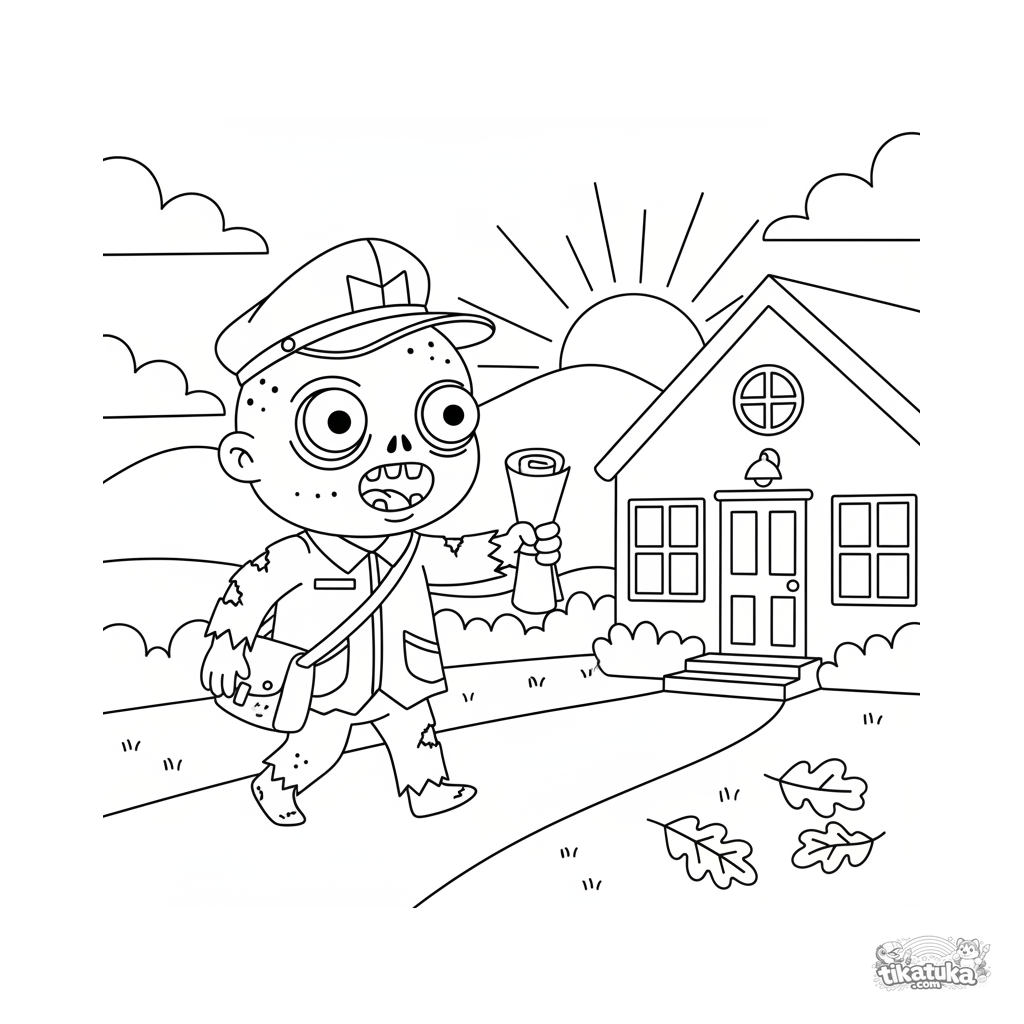 Ausmalbild eines freundlichen Zombie-Briefträgers, der Zeitungen im Morgengrauen zustellt. Für Jungen von 4-6 Jahren. Eine lustige, nicht gruselige Cartoon-Szene.