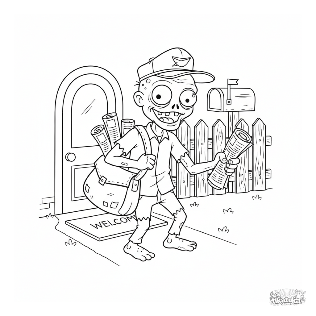 Ausmalbild für Jungen 4-6: ein freundlicher Cartoon-Zombie mit Briefträgermütze liefert eine gerollte Zeitung an eine Haustür.