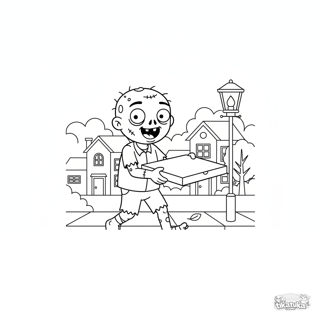 Ausmalbild eines freundlichen Zombie-Lieferanten. Für Jungen von 4-6 Jahren. Ein fröhlicher Zombie trägt eine Pizzaschachtel eine ruhige Straße hinunter in der Dämmerung.