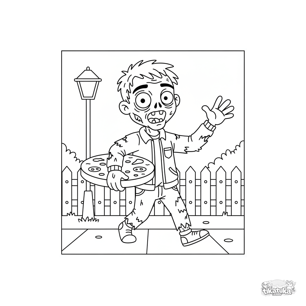 Ausmalbild eines freundlichen Zombies, der nachts eine Pizza liefert. Für Jungen von 4-6 Jahren. Dem Zombie fehlt ein Schuh, er lächelt und trägt eine Kiste.