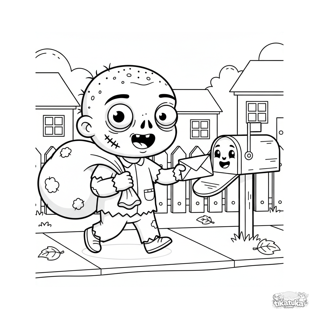 Ausmalbild für Jungen von 4-6 Jahren. Ein alberner, freundlicher Zombie-Postbote bringt Briefe auf einer Straße. Lustige, unerschreckende Monsterszene.