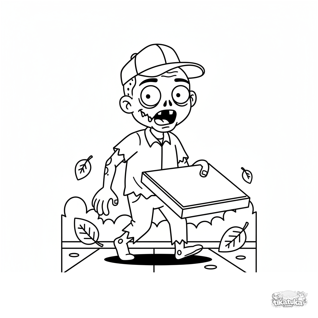 Ein einfaches Ausmalbild für Kleinkinder von 2-3: ein niedlicher Cartoon-Zombie-Lieferant trägt eine Pizzaschachtel. Sehr große, einfache Formen ohne gruselige Details.