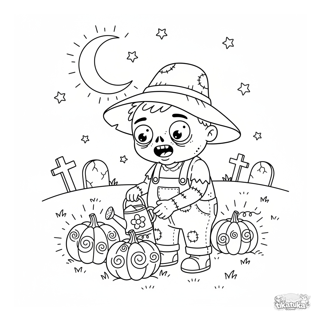 Kinder Ausmalbild: ein freundlicher Zombie-Gärtner gießt leuchtende Kürbisse in einem mondbeschienenen Garten. Lustiges, unerschreckliches Thema für Kinder von 4-6.