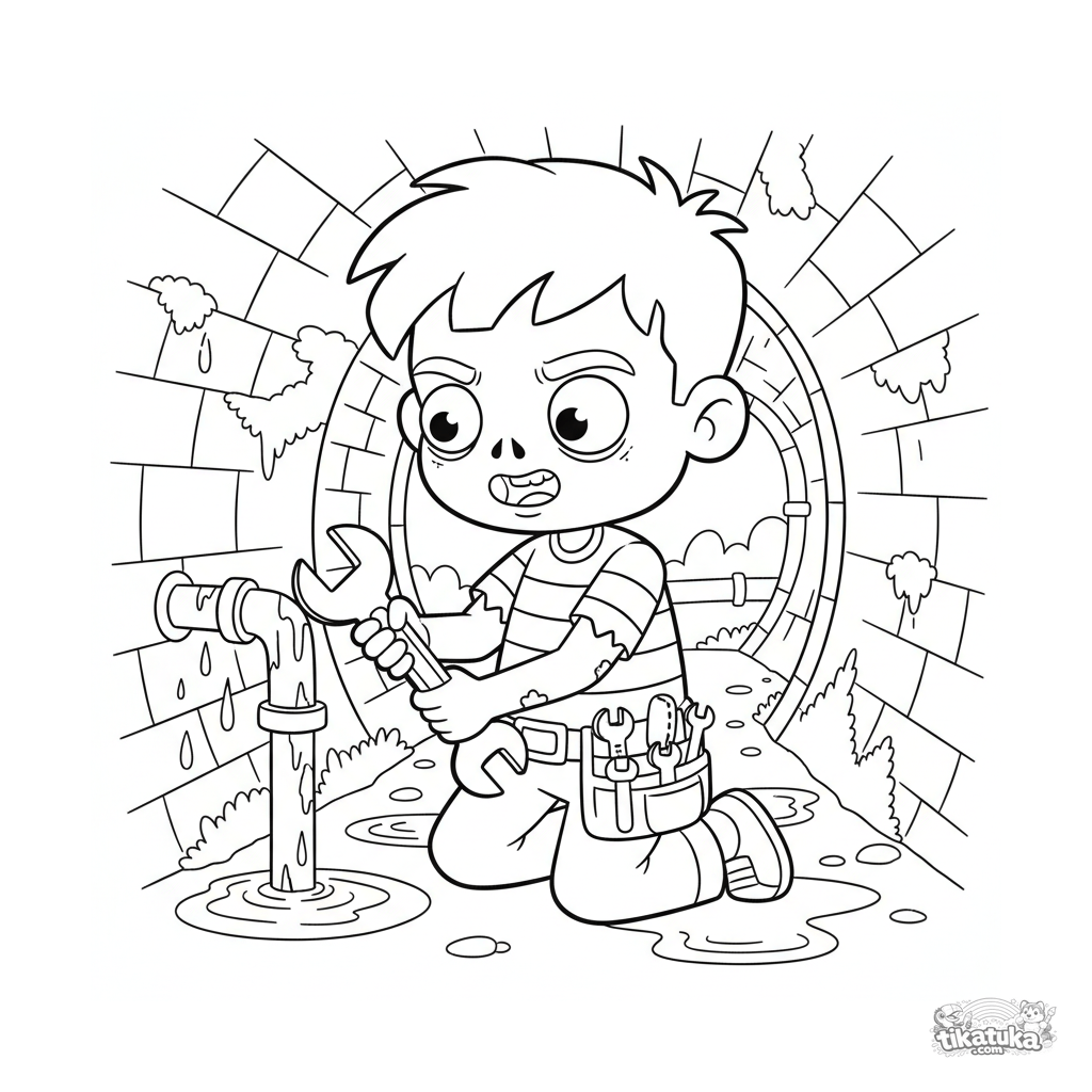 Ausmalbild für Kinder 4-6: Ein freundlicher Zombie-Klempner repariert ein undichtes Rohr in einem Abwasserkanal. Eine lustige, nicht gruselige Szene.