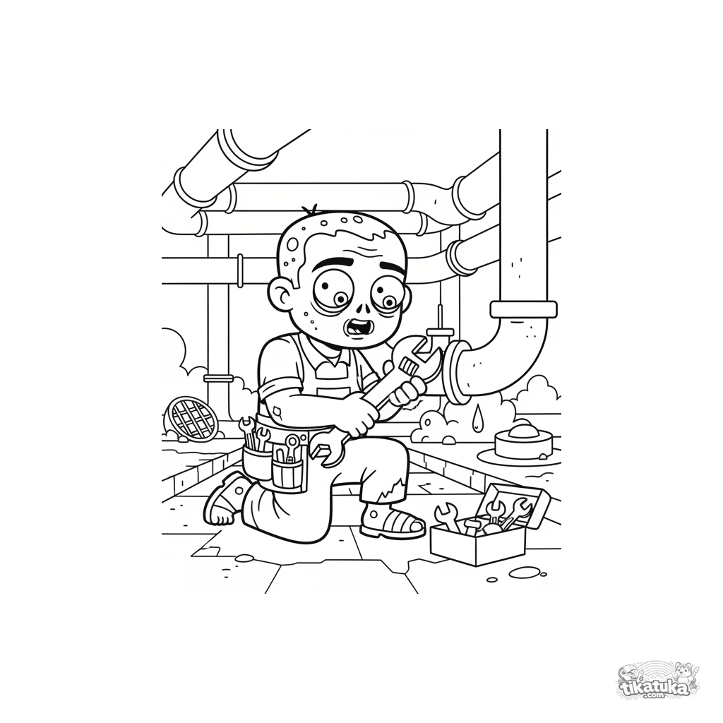 Ausmalbild eines freundlichen Zombie-Klempners, der ein Leck in einem Abwasserkanal repariert. Für Kinder von 7-9 Jahren. Eine lustige und nicht gruselige Szene.