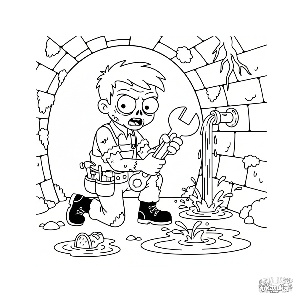 Ausmalbild für Kinder 4-6: ein freundlicher Zombie-Klempner repariert ein Rohr in einem Abwasserkanal. Eine lustige, nicht gruselige Szene.
