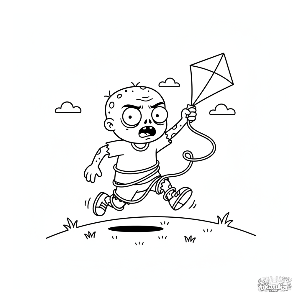 Ausmalbild eines freundlichen Zombies für Jungen von 4-6 Jahren. Der Zombie rennt über einen Hügel und versucht, einen Drachen steigen zu lassen, die Schnur ist verheddert.