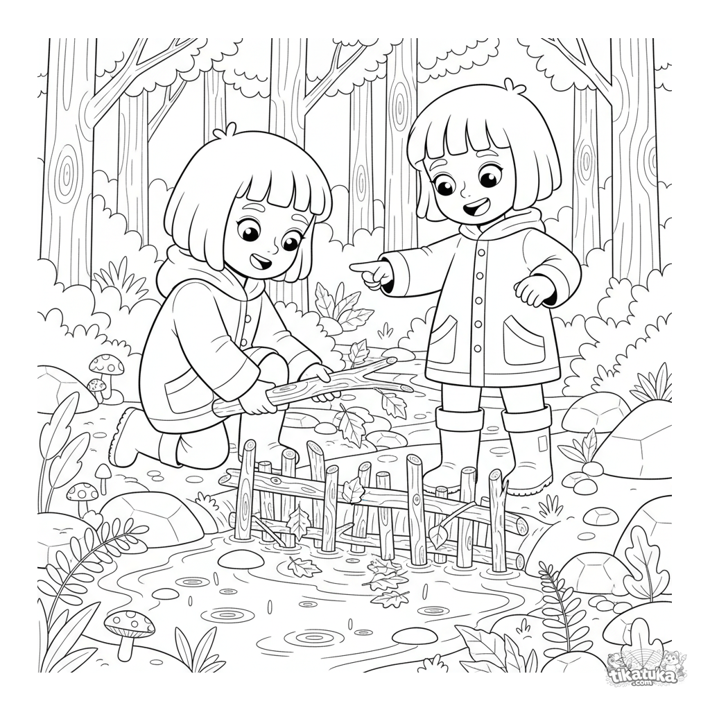 Ausmalbild für ältere Kinder 10-12: zwei Freunde in Regenmänteln bauen einen Blätterdamm in einem Waldbach im Herbstregen. Detaillierte Szene mit Texturen.