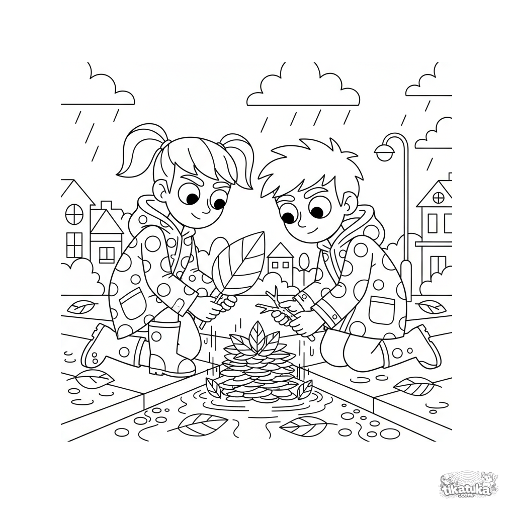 Ausmalbild für ältere Kinder 10-12 Jahre: zwei Freunde in Gummistiefeln bauen einen Laubdamm in einer Straßenrinne im Herbstregen.