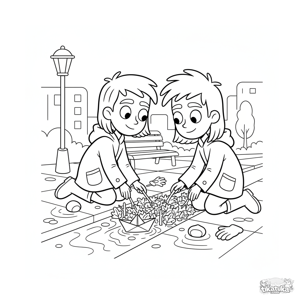 Ausmalbild für Kinder 7-9: Zwei Freunde in Gummistiefeln bauen einen Laubdamm in einer Straßenrinne unter Herbstregen.
