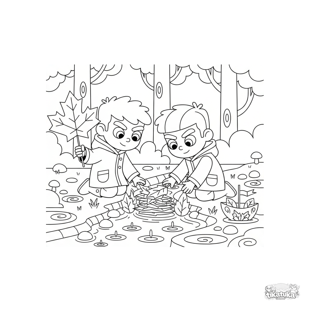 Ausmalbild für Kinder 7-9: zwei Freunde in Regenjacken bauen einen Laubdamm an einem Waldbach an einem regnerischen Herbsttag. Dynamische Szene.