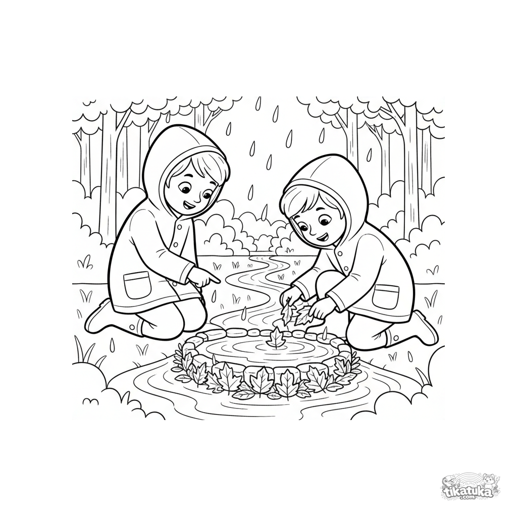 Ausmalbild für Kinder (7-9 Jahre): zwei Freunde in Regenjacken bauen einen Laubdamm in einem Herbstbach im Regen. Aktionsszene mit mäßigen Details und ausdrucksstarken Posen.