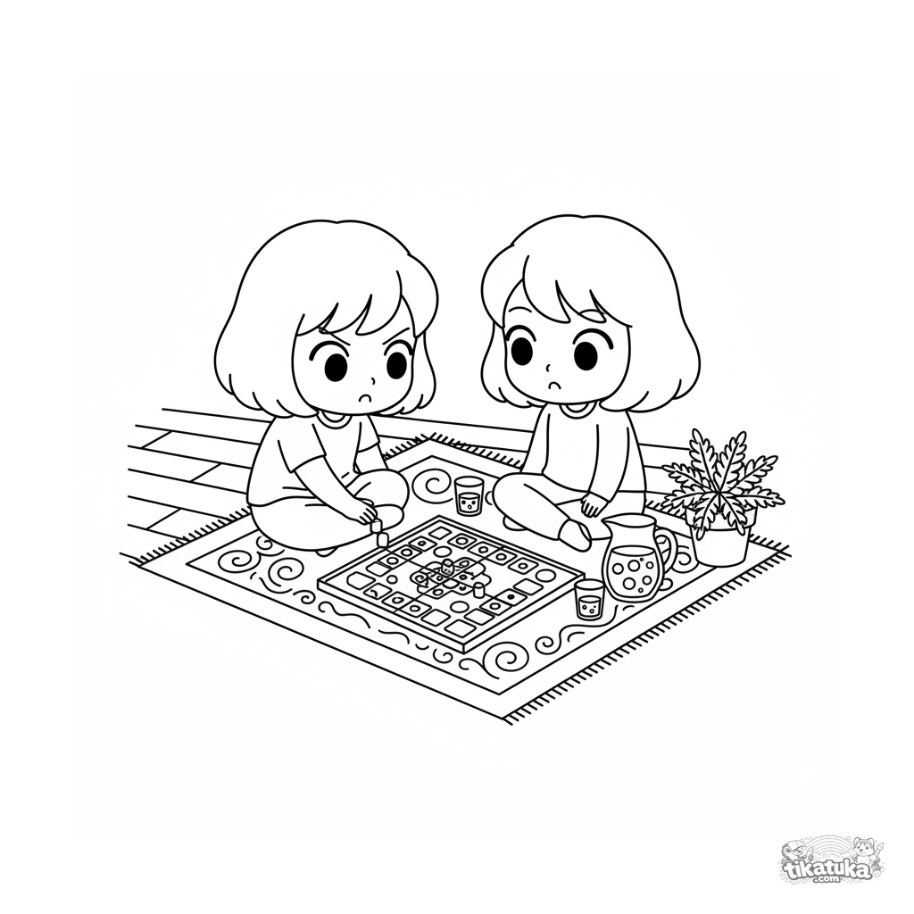 Ausmalbild für Kinder 7-9: zwei Freunde spielen ein Brettspiel auf einem Teppich auf der Veranda eines Sommerhauses. Szene mit Limonadenkrug und Spielsteinen.