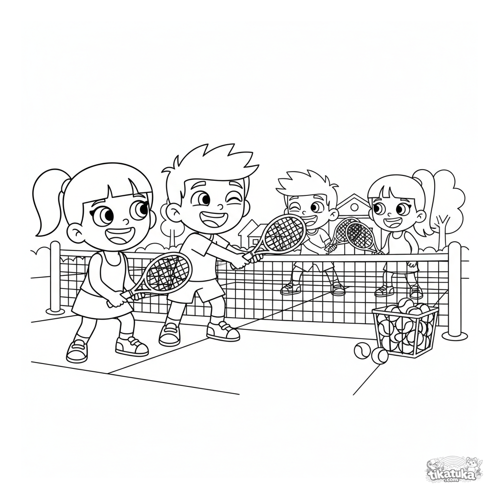 Ausmalbild für Kinder 7-9: Eine lustige Doppeltennis-Szene mit vier Freunden, die auf dem Platz spielen und lachen. Dynamische Posen, Netz, Schläger.