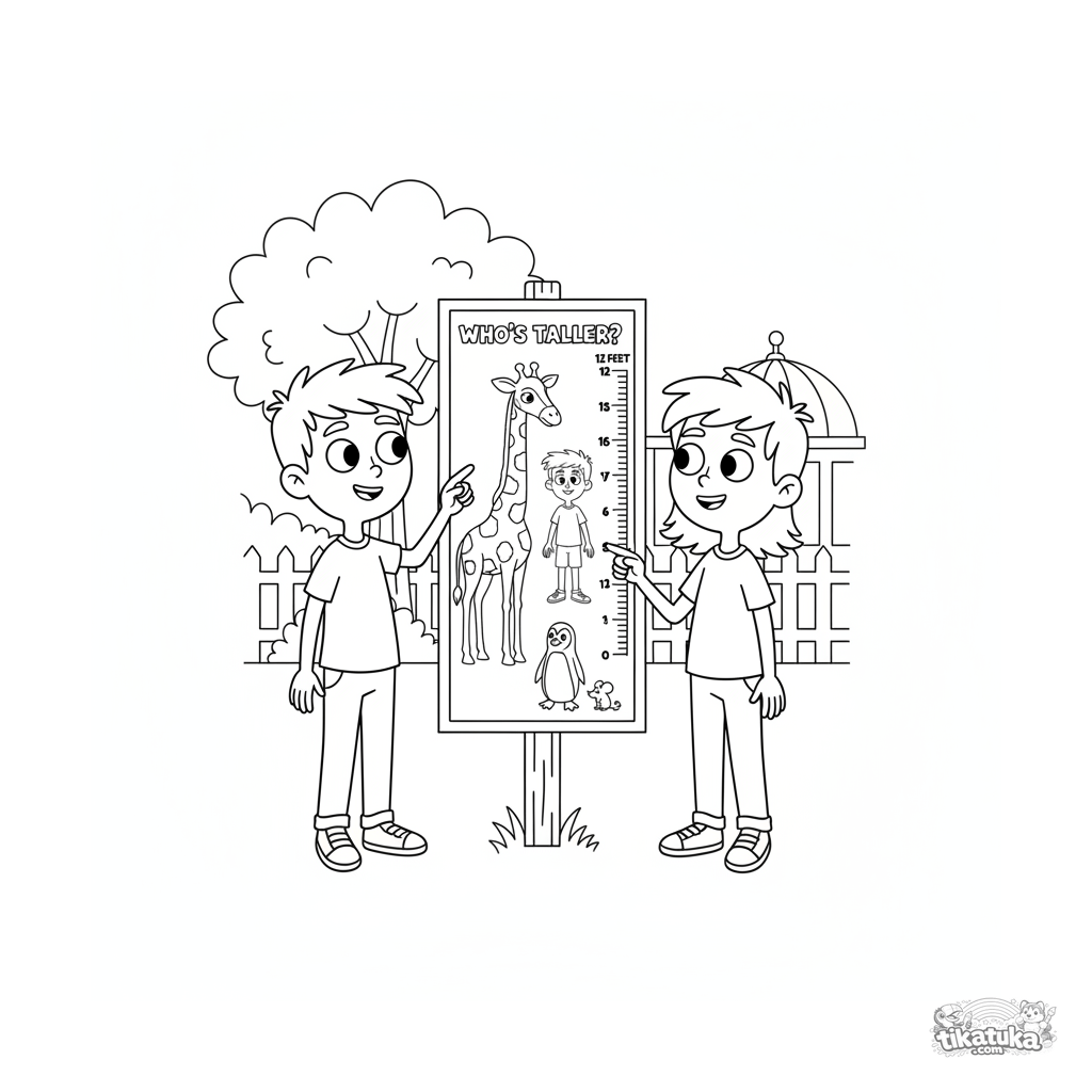 Ausmalbild für Kinder 7-9: Freunde studieren eine Tabelle, die Tiergrößen im Zoo vergleicht. Dynamische Lernszene über Größe und Messung, gut für Gruppen.