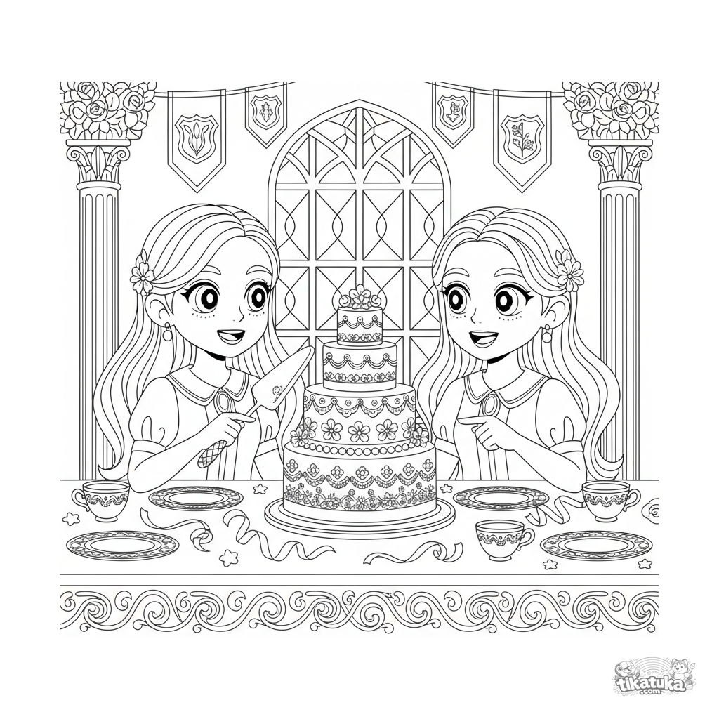 Detailliertes Ausmalbild für ältere Kinder 10-12: Zwei Freundinnen teilen einen festlichen Kuchen an einem Tisch in einer dekorierten Halle. Freundschaftsszene.