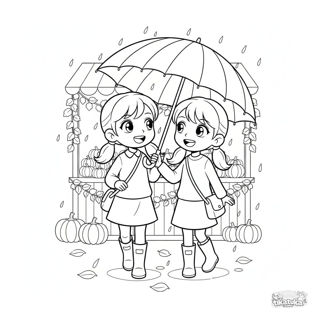 Ausmalbild für Kinder 7-9 Jahre: zwei Freunde teilen sich einen Schirm und gehen im Regen an einem Herbstmarktstand vorbei. Mäßiges Detail, ausdrucksstarke Posen.