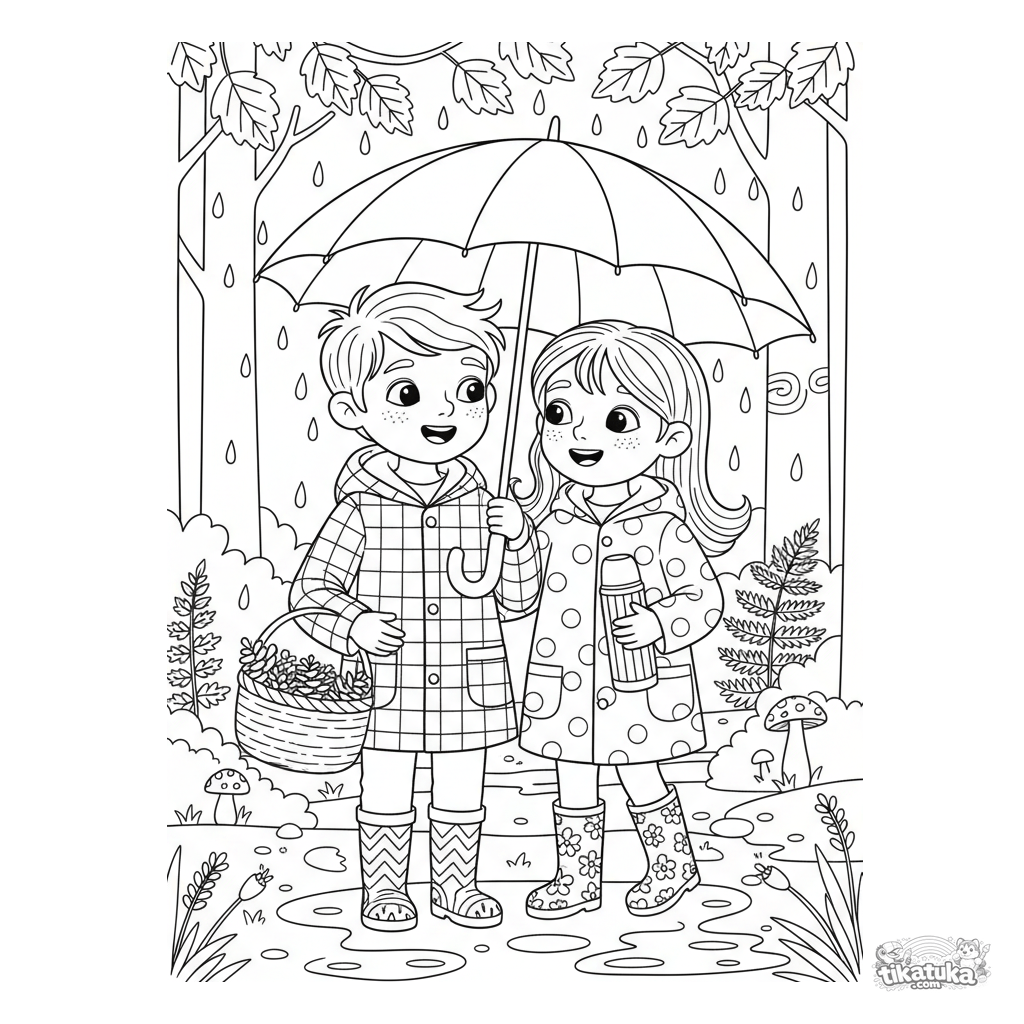 Ausmalbild für Tweens 7-9 Jahre: zwei Freunde gehen unter einem Regenschirm auf einem matschigen Waldweg im Herbstregen und tragen einen Korb mit Tannenzapfen. Mäßiges Detail, stimmungsvolle Szene.