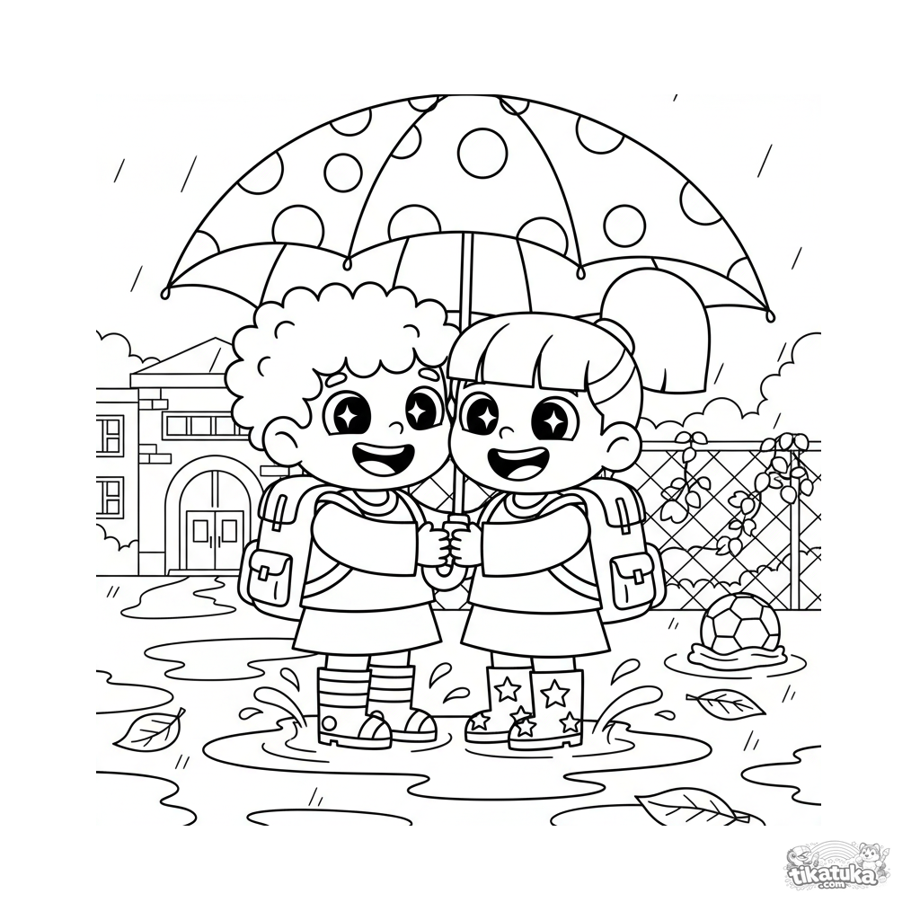 Ausmalbild für Tweens 7-9: Zwei fröhliche Freunde unter einem großen Regenschirm laufen über einen nassen Herbst-Schulhof. Szene mit Rucksäcken und Pfützen.
