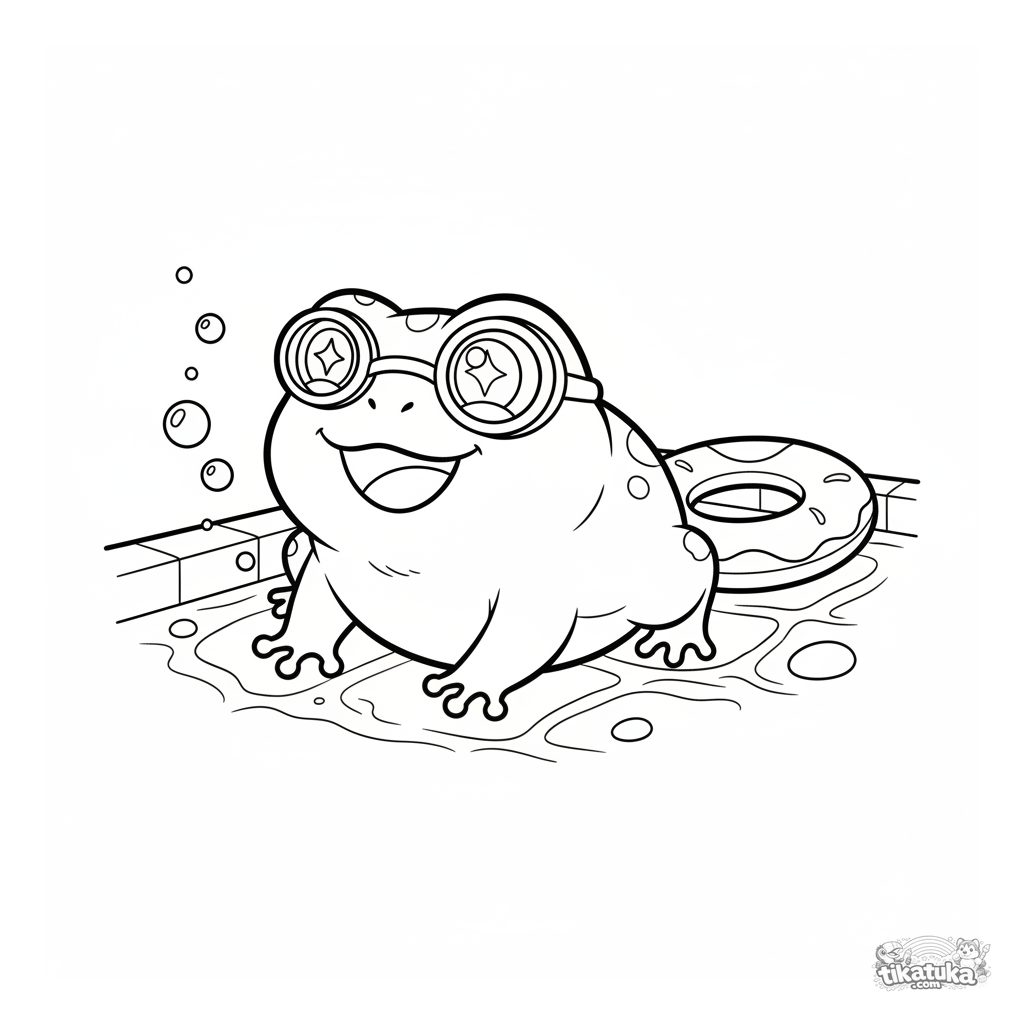 Ausmalbild eines Froschtäuchers mit Brille am Poolboden. Für Kinder von 7-9 Jahren.