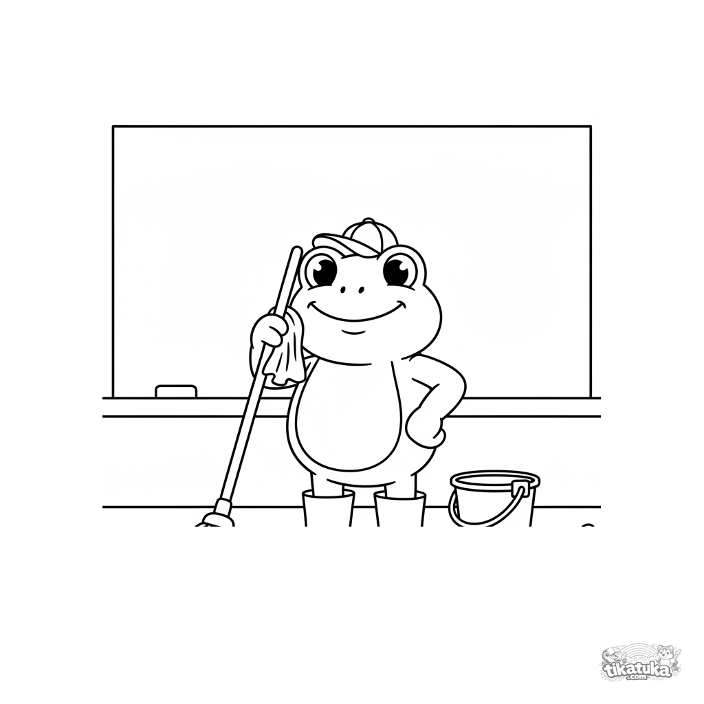 Ausmalbild für Kleinkinder von 2-3 Jahren: ein Frosch-Hausmeister mit Mopp und Eimer im Klassenzimmer. Einfache, große Formen.