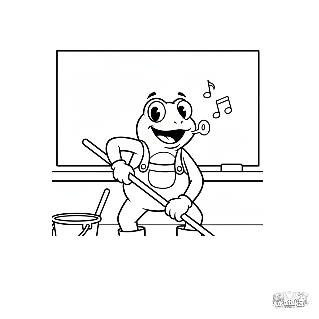 Ausmalbild für Kleinkinder 2-3: Ein fröhlicher Frosch-Hausmeister in Overall wischt den Boden unter der Schultafel im Klassenzimmer, einfache große Formen.