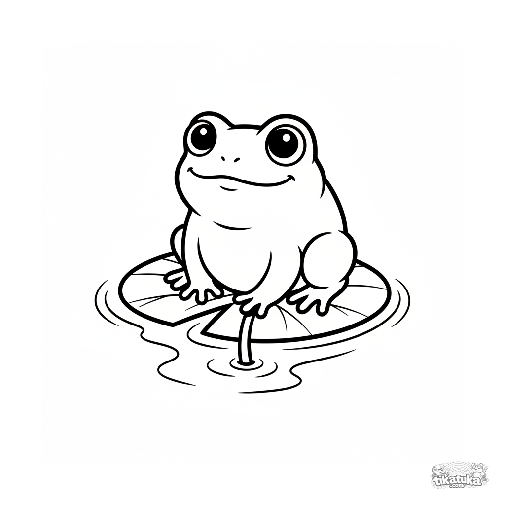 Einfaches Ausmalbild für Kleinkinder 2-3: Ein süßer, runder Frosch sitzt auf einem Seerosenblatt in einem Bach. Große Formen, wenige Details.