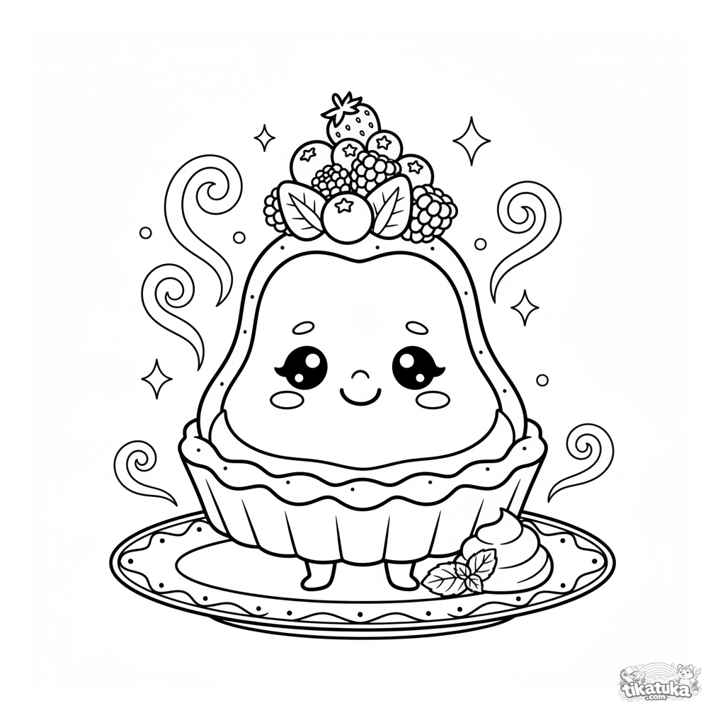 Ausmalbild für Kinder: Eine lächelnde Obsttarte balanciert Beeren auf ihrem Kopf, während sie auf einem Teller steht. Lustige und niedliche Szene für Kinder von 4-6 Jahren.