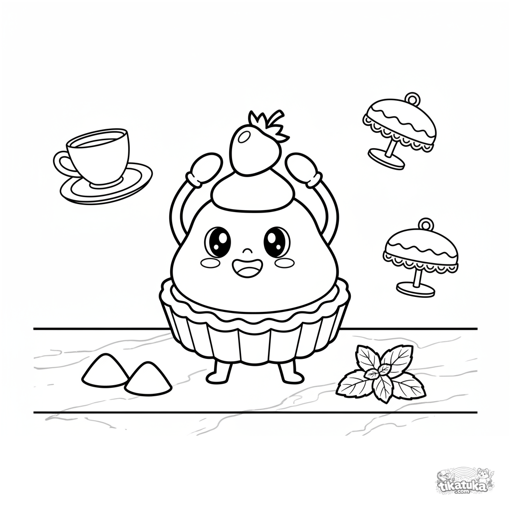 Ausmalbild: Eine Obsttarte balanciert eine Beere auf einer Marmor-Café-Theke. Lustige Szene mit Puderzucker und Minze. Für 4-6 Jahre.