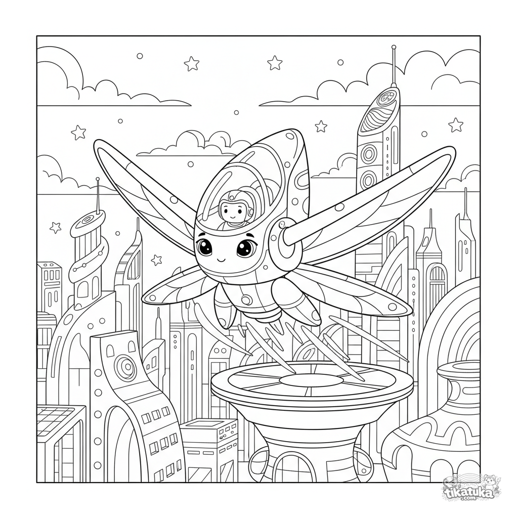 Detailliertes Ausmalbild eines futuristischen Flügelfahrzeugs vor einer Zukunftsstadt. Für Kinder 10-12. Saubere Linien, transparente Haube, futuristische Architektur. Anspruchsvoll zum Ausmalen.