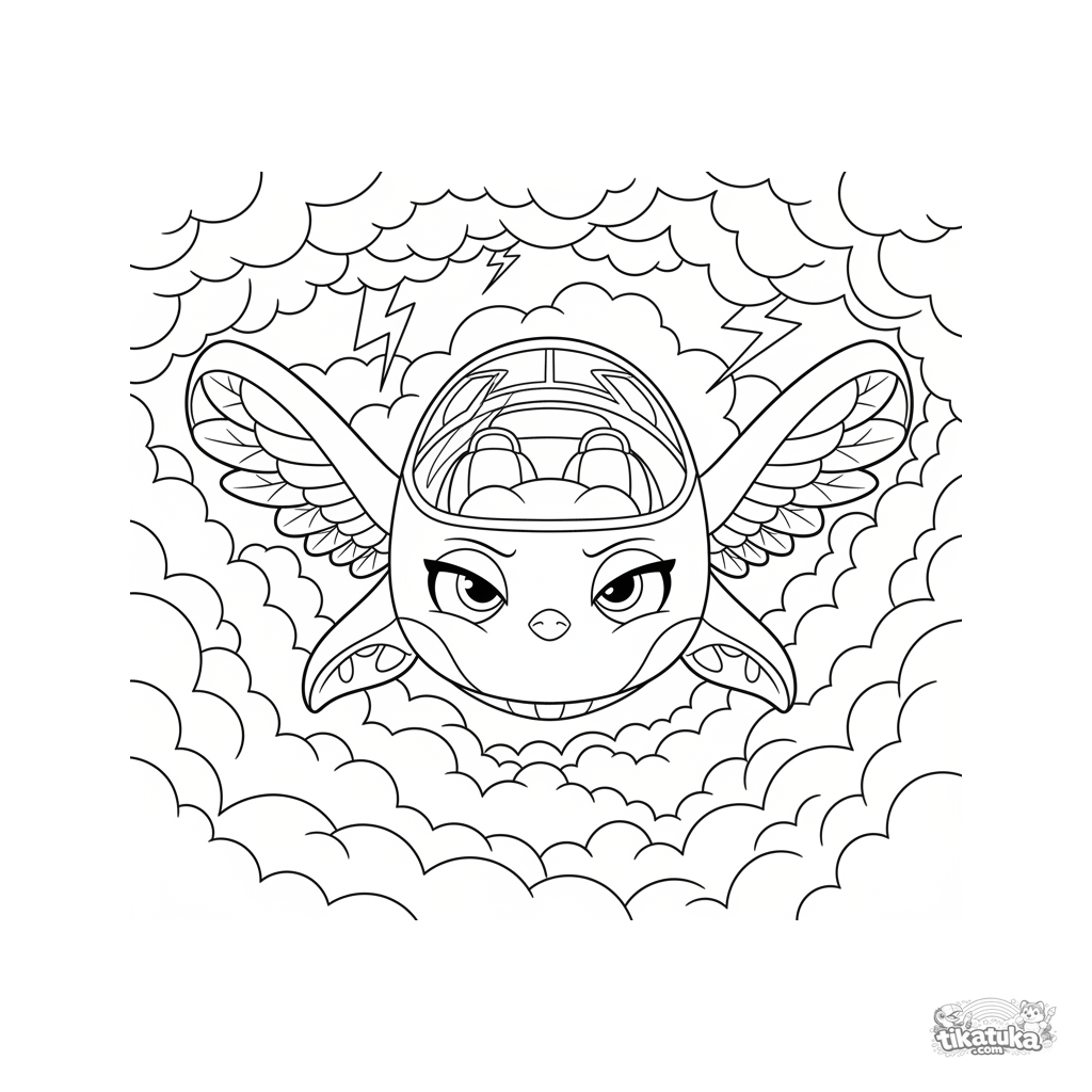Ausmalbild für 10-12 Jahre: Ein futuristisches Flugfahrzeug fliegt durch einen stürmischen Himmel mit Blitzen. Dynamische Linien, detailliertes Design.