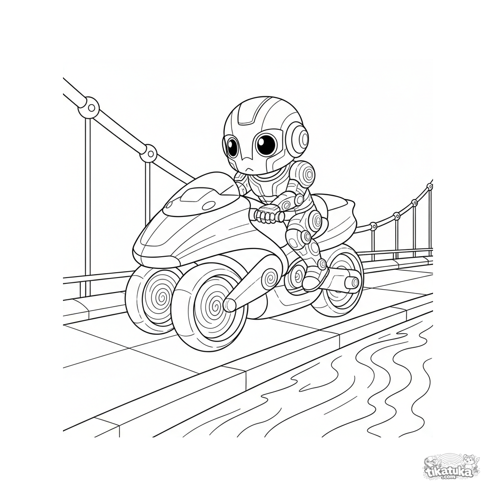 Detailliertes Ausmalbild für Kinder 10-12: Ein futuristisches Patrouillen-Hoverbike und sein Roboterfahrer auf einer Brücke. Komplexe Techno-Szene.