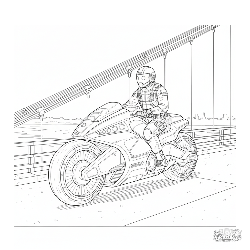 Ausmalbild für ältere Kinder 10-12: Ein futuristisches Hoverbike patrouilliert auf einer Hängebrücke über einem Fluss. Ein behelmter Offizier scannt das Gebiet.