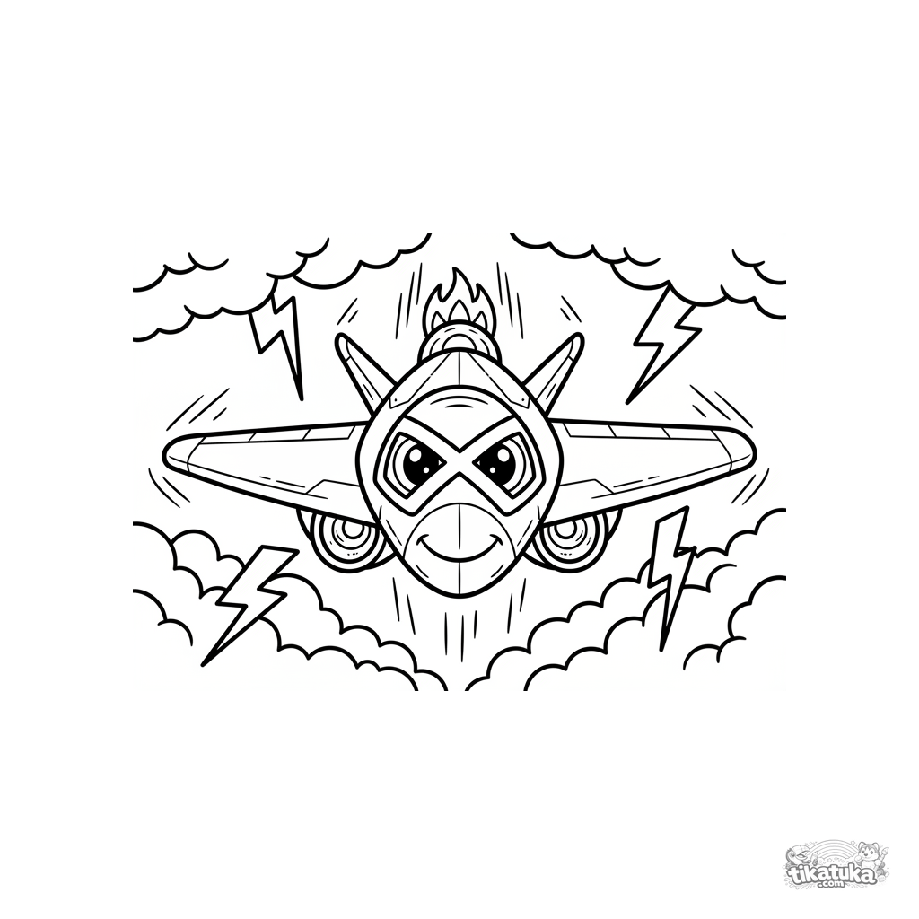 Dynamisches Ausmalbild eines futuristischen Jets, der durch einen stürmischen Himmel fliegt. Für Kinder von 7-9 Jahren. Comic-Stil, dramatische Beleuchtung.