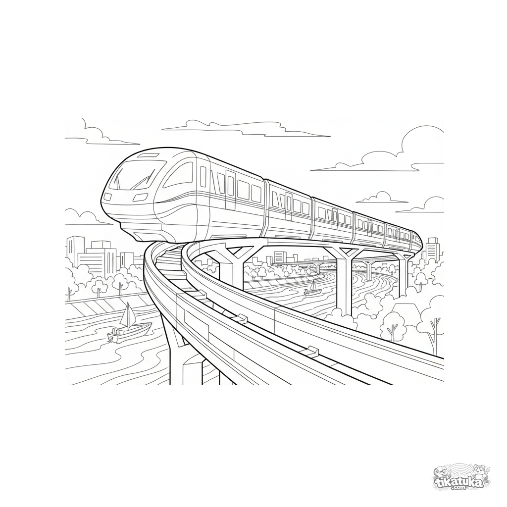 Detailliertes Ausmalbild für 10-12 Jahre: Eine futuristische Einschienenbahn auf einer Brücke über einem Fluss. Sauberes, technologisches Design im Blaupausen-Stil.