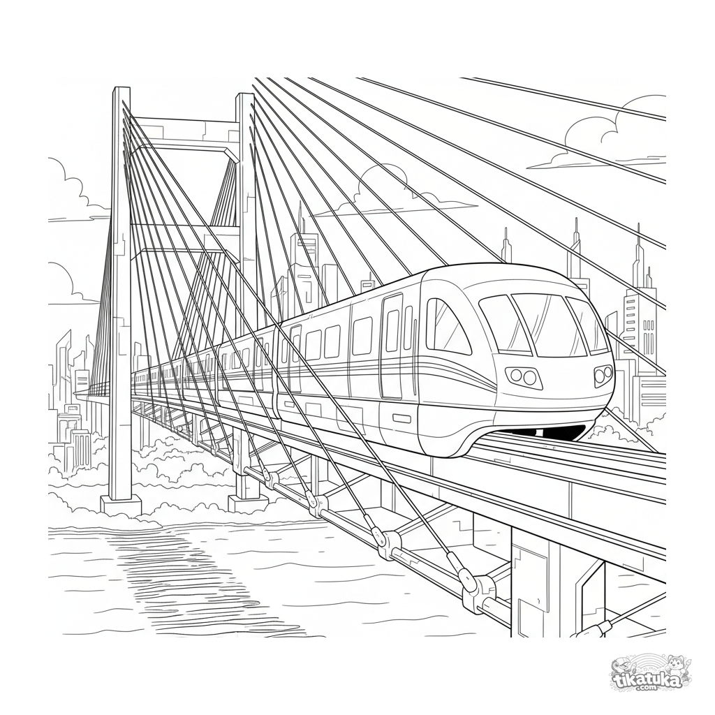 Ausmalbild einer futuristischen Monorail auf einer Hängebrücke über einem Fluss. Für ältere Kinder 10-12. Technische Details.
