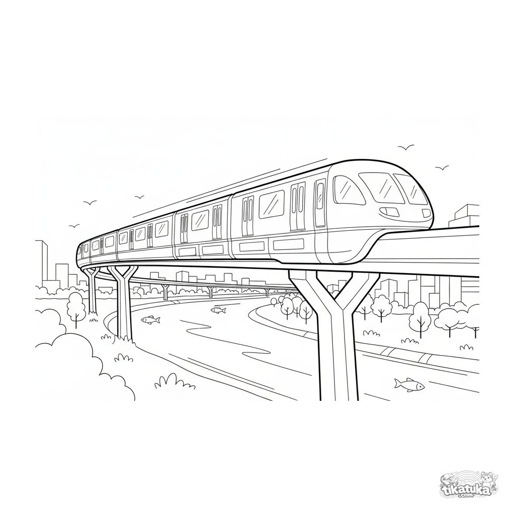 Ausmalbild für Tweens 7-9: ein futuristischer Monorail-Zug rast über eine hohe Brücke über einen windenden Fluss.