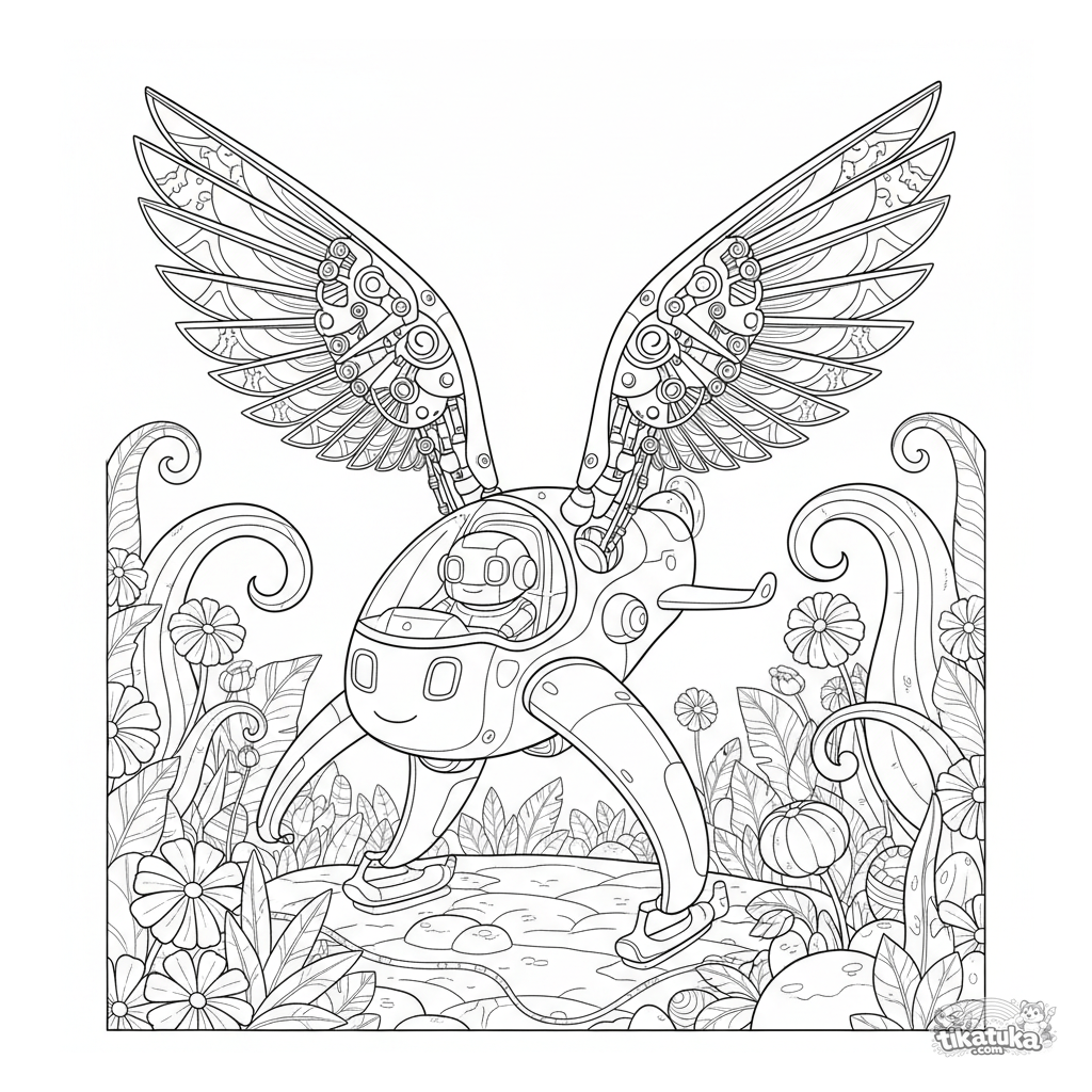 Komplexes Ausmalbild im Graphic-Novel-Stil für 10-12 Jahre: Ein futuristischer Ornithopter landet im Dschungel. Detaillierte Mechanik und Natur.